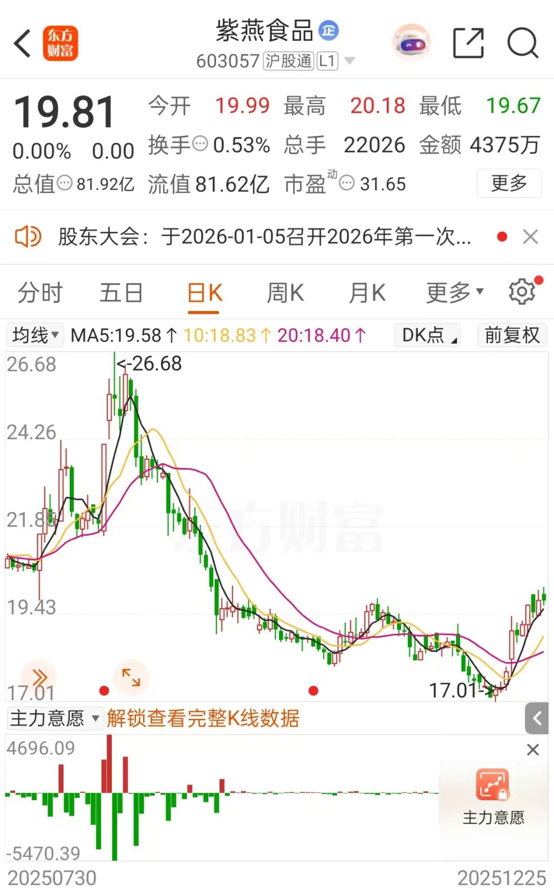 截至12月25日收盘,紫燕食品报19.81元/股,总市值为81.92亿元。